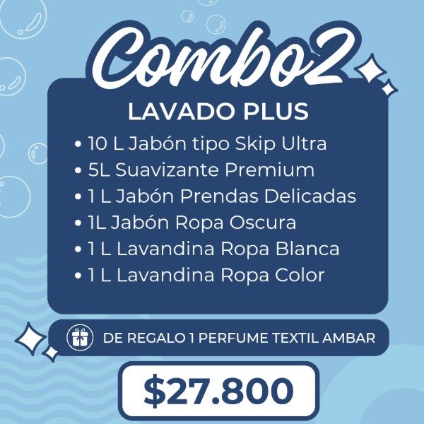 Ahorrá un montón sin resignar la calidad en la limpieza de tus prendas . Te llevas de regalo un perfume textil para dejarlas súper perfumadas . La cantidad de cada producto está pensada para muchos lavados así no tenés que volver a comprar por un tiempo largo