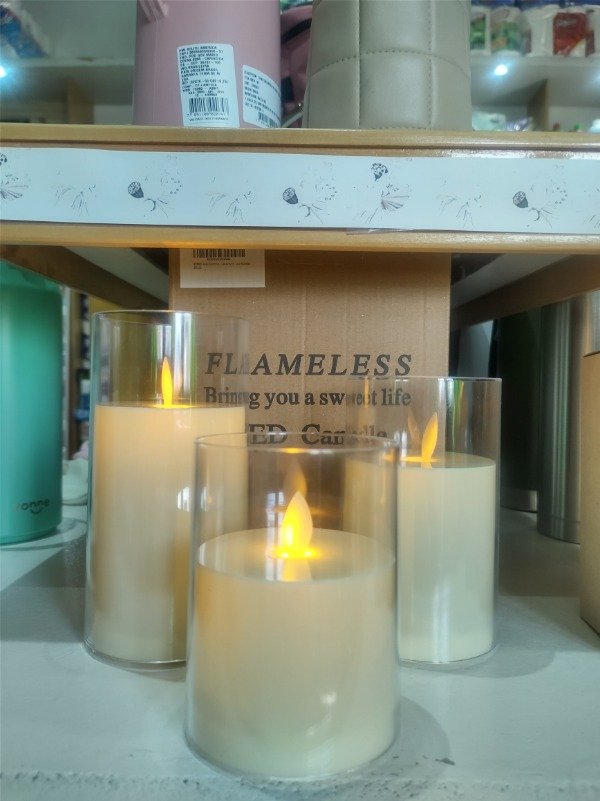 Incluyen control remoto para seleccionar la intensidad y el movimiento de las llamas . El Set incluye una vela grande, una mediana y una pequeña. Incluye pilas .